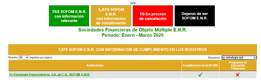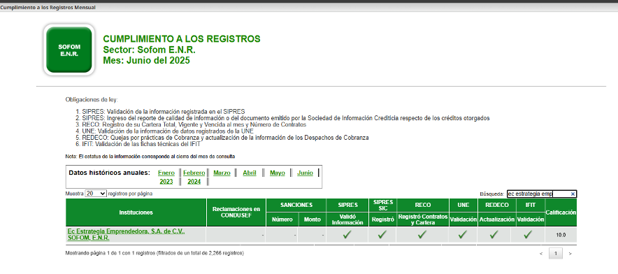 El Buró de Entidades Financieras contiene información de EC ESTRATEGIA EMPRENDEDORA S.A. de C.V., SOFOM, E.N.R. (EKON) sobre nuestro desempeño frente a los Usuarios, por la prestación de productos y servicios.